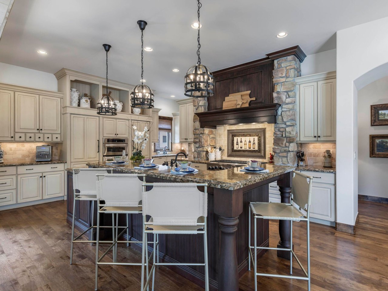 The interior of the home is casual yet refined, a blend of comfort and luxury. The kitchen is fitted with state-of-the-art appliances, including an 8-burner gas stove and SubZero refrigerators, granite countertops, and antique white cabinetry complements the wood floors, adding a sophisticated touch. The pantry is thoughtfully designed, with glass display shelving, prep station, and abundant storage. A dramatic, exposed-beam ceiling caps the great room where a beautiful fireplace sets an inviting stage for post-dinner conversations. A separate eating area showcases banks of windows and a sliding door opening to the pool and grounds. French doors lead to a comfortable study with exquisite millwork and opens to the courtyard.