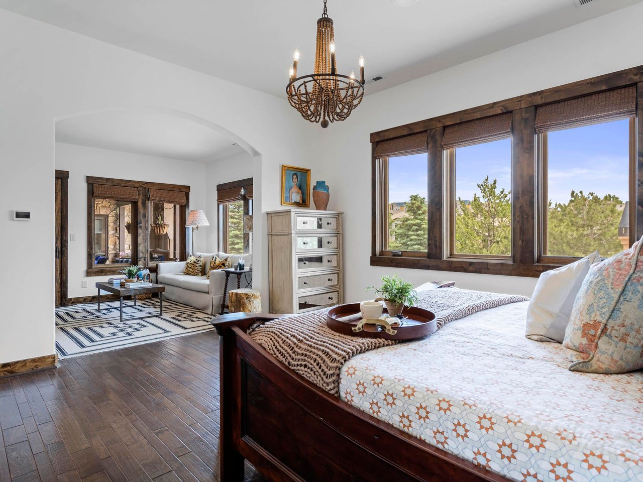 The upper level is home to the luxurious master suite, complete with a cozy sitting area and fireplace, with access to a covered deck with fireplace. The ensuite bathroom features a striking copper freestanding tub and a large dual-entry shower equipped with a granite bench and twin shower heads. Three bedrooms have ensuites, offering large windows that frame mountain vistas.